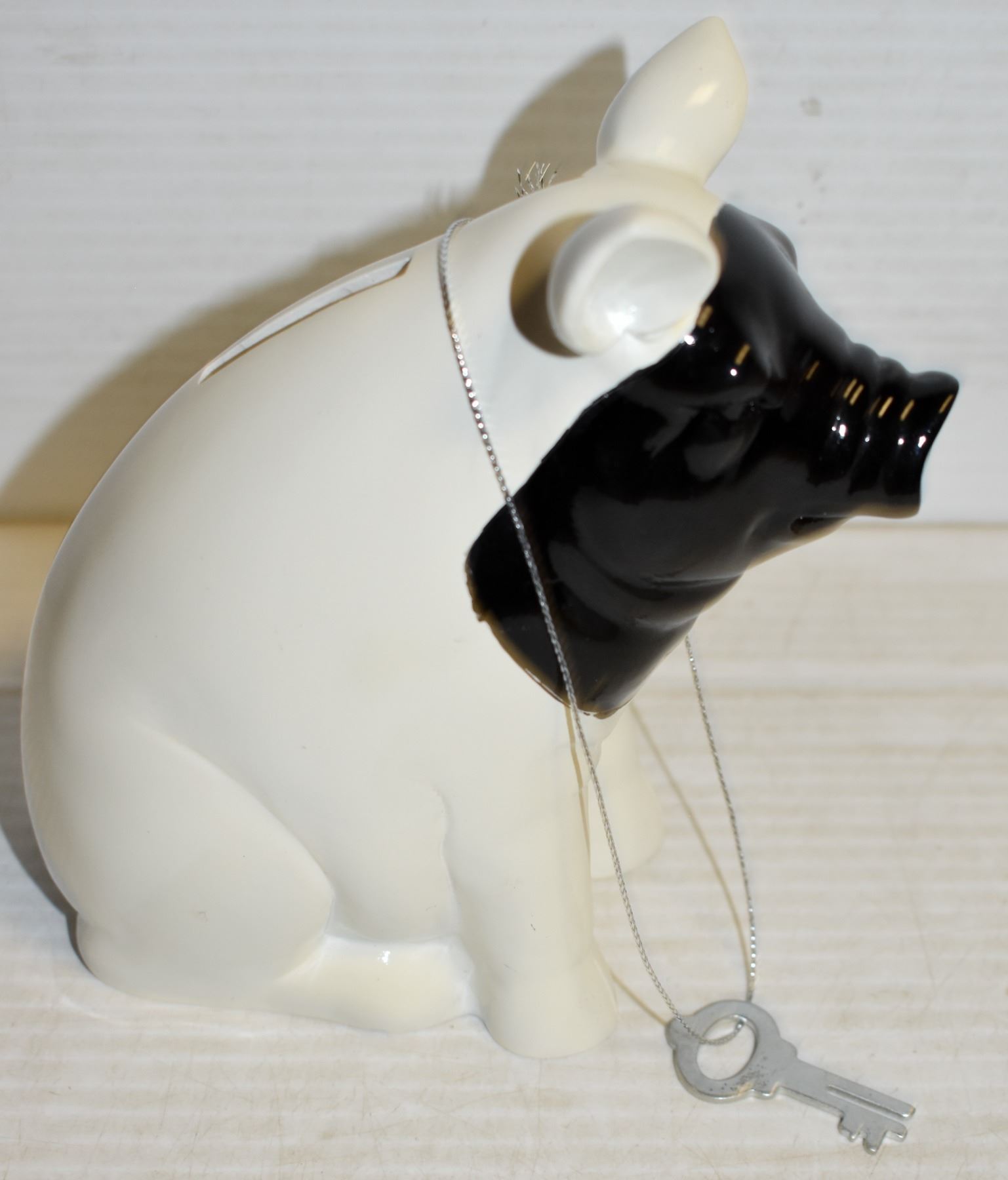 PIG PIGGY BANK WITH KEY, SITTING WHITE PIG WITH BLACK FACE. 6 INCHES TALL X 3 INCHES WIDE. COLLECTIBLE