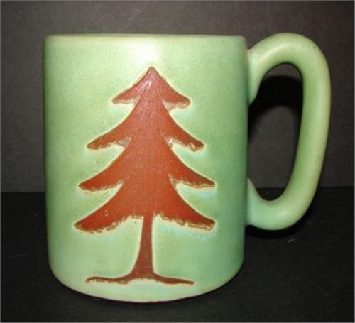 PIGEON FORGE POTTERY MUG. Decorated with evergreen tree. Marked on bottom "The/Pigeon Forge/Pottery/Pigeon Forge/Tenn. 4.25" H