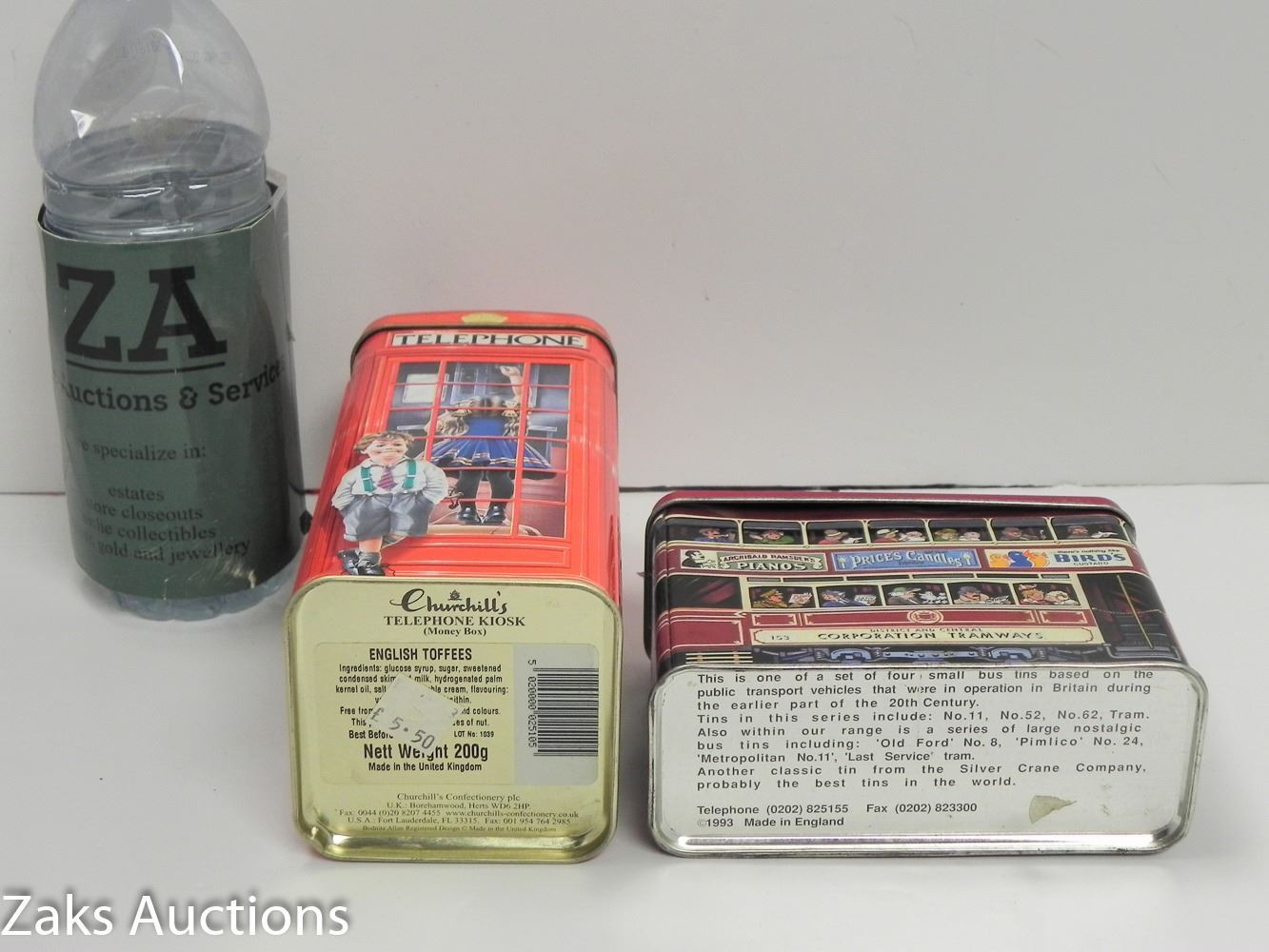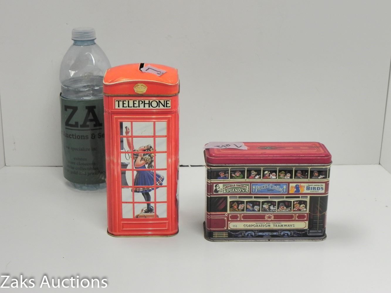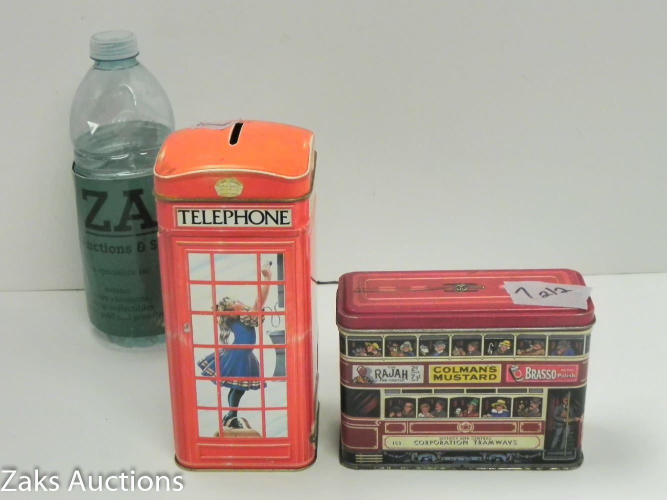 PIGGY BANK CHURCHILL'S TELEPHONE KIOSK TIN, CORPORATION TRAMWAYS TIN