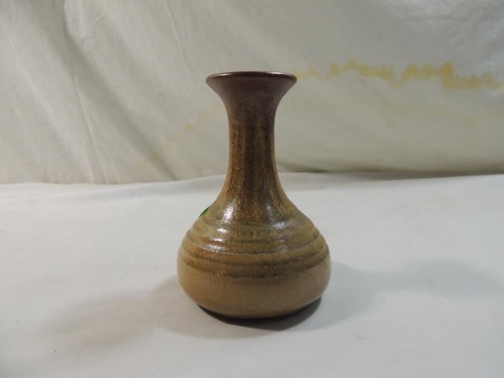 SIGNED PIGIM FIRGE A HUSKEY POTTERY VASE. DECORATIVE BUD VASE AS SHOWN SEE PHOTO FOR MORE DETAILS.