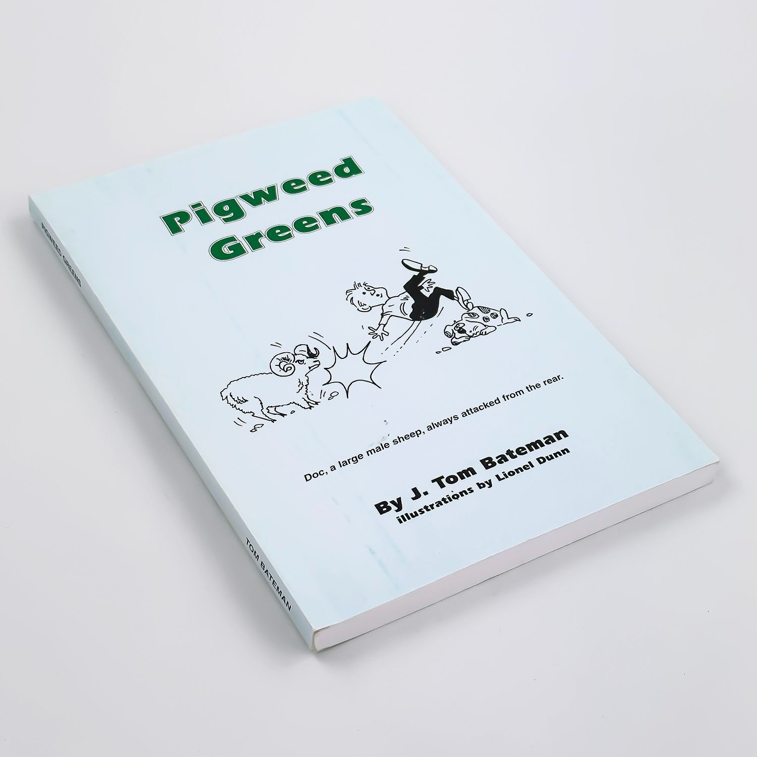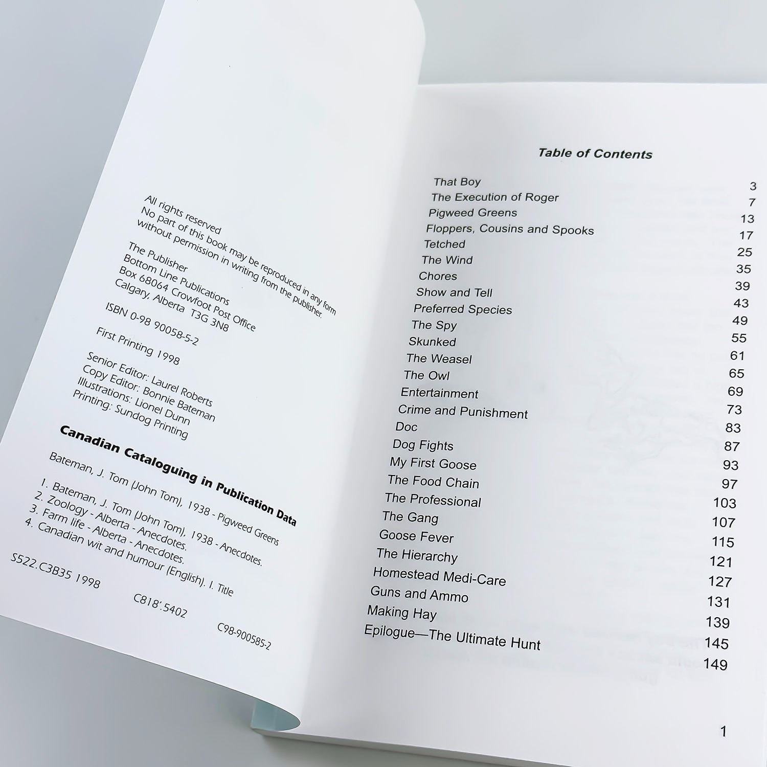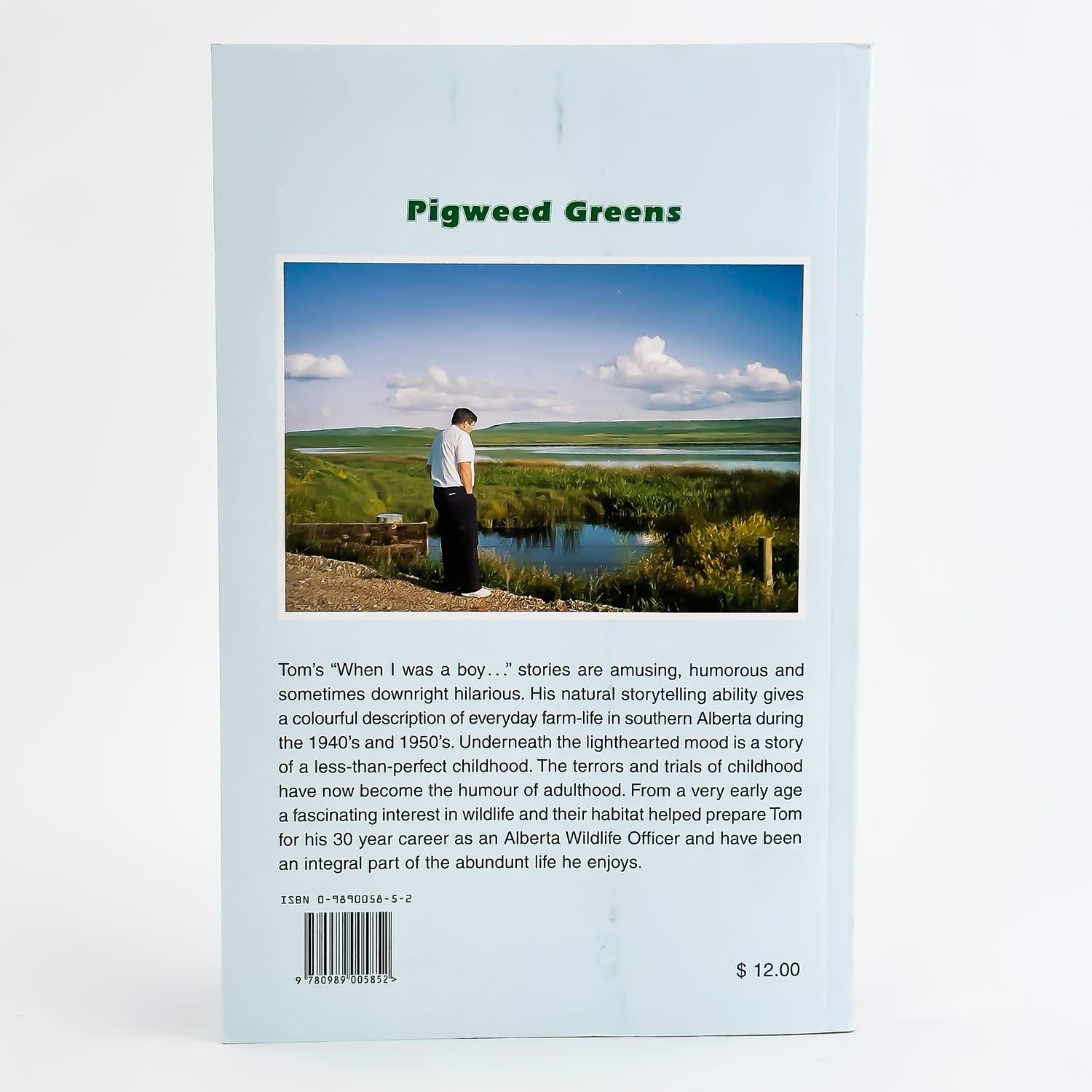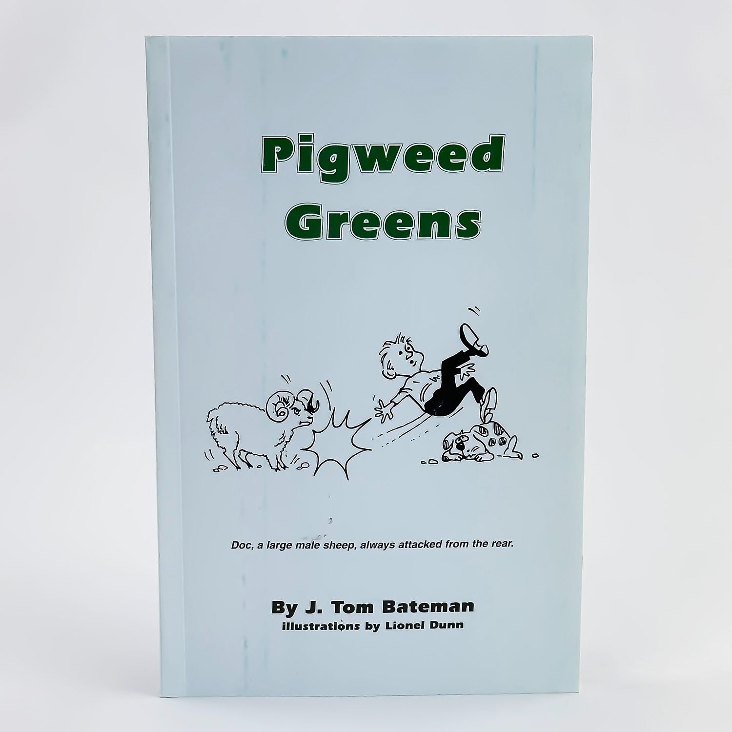 #8117 - AMUSING, HUMOROUS & SOMETIMES HILARIOUS STORYTELLING ON EVERYDAY FARM-LIFE IN SOUTHERN ALBERTA IN THE 40’S & 50’S. PIGWEED GREENS BY TOM BATEMAN WHOM HAD A 30 YEAR CAREER AS AN ALBERTA WILDLIFE OFFICER. BOTTOM LINE PUBLICATIONS, CALGARY - FIRST PRINTING 1998. SOFTCOVER - 5.5” X 8.5”, 160 PAGES