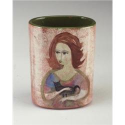 PILLIN flattened vase with woman holding a kitten on each side, (eyes open and eyes closed) in polychrome with avocado interior. Signed Pillin. Nick to rim. 6" x 4 1/2" x 3" $500 - 750