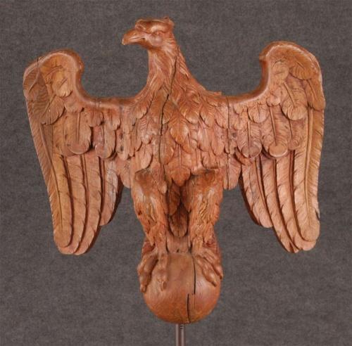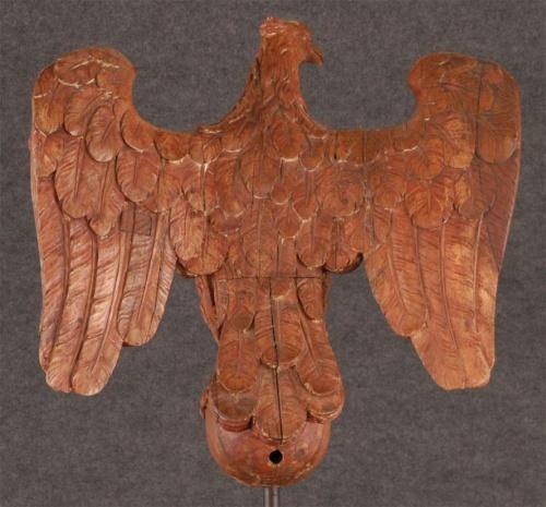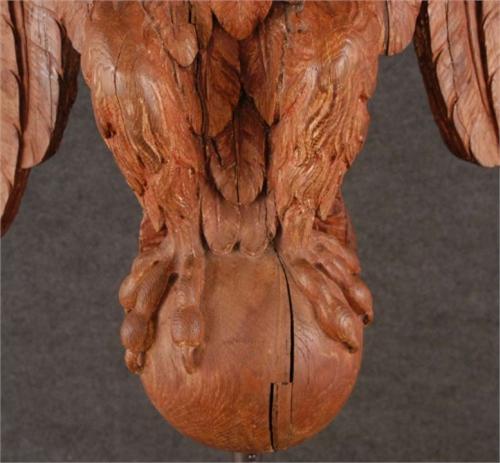 PILOT HOUSE EAGLE the carved bird perched on an orb with wings pulled back, 30"high, 29"wingspan 19th century <BR>condition: original painted/gilt surface since stripped leaving red wash, shrinkage splits, small patch to back of wing and larger strip rep