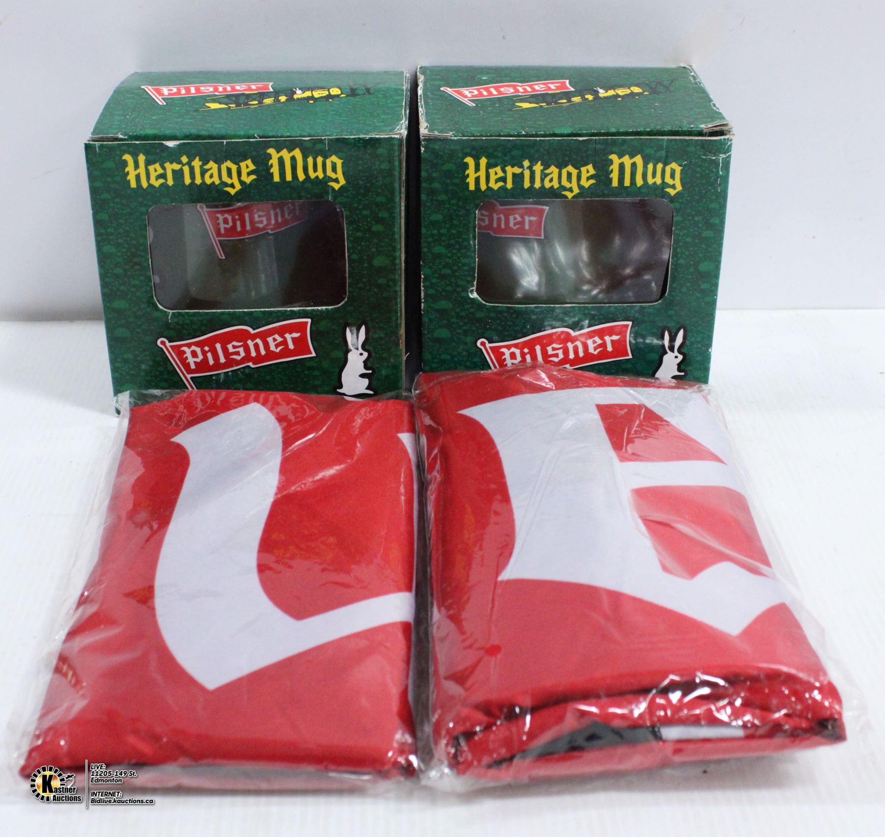 TWO LARGE PILSNER MUGS WITH WHITE RABBIT AND TWO 5 FOOT BANNER FLAGS.