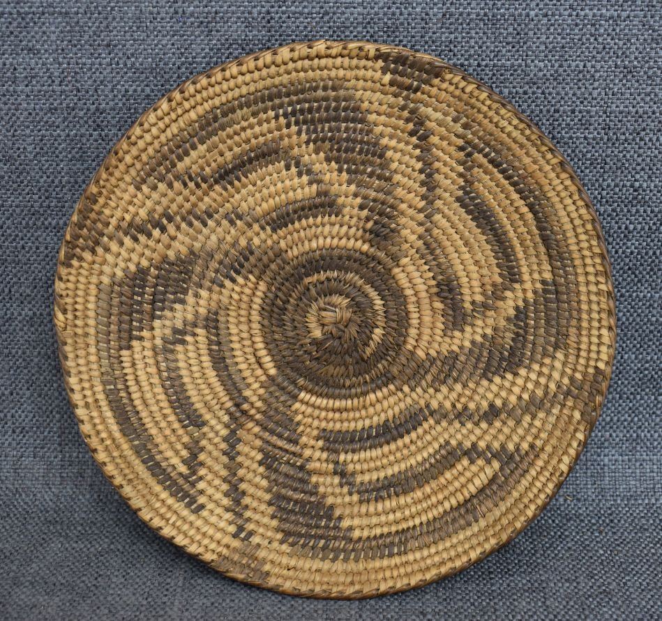 1920-30's Pima Indian hand woven basketry whirling log design 8" diameter