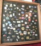 18.5"X 18.5" HEAVY WOOD AND GLASS SHADOW BOX. AMAZING COLLECTION OF OVER 100 PINS.