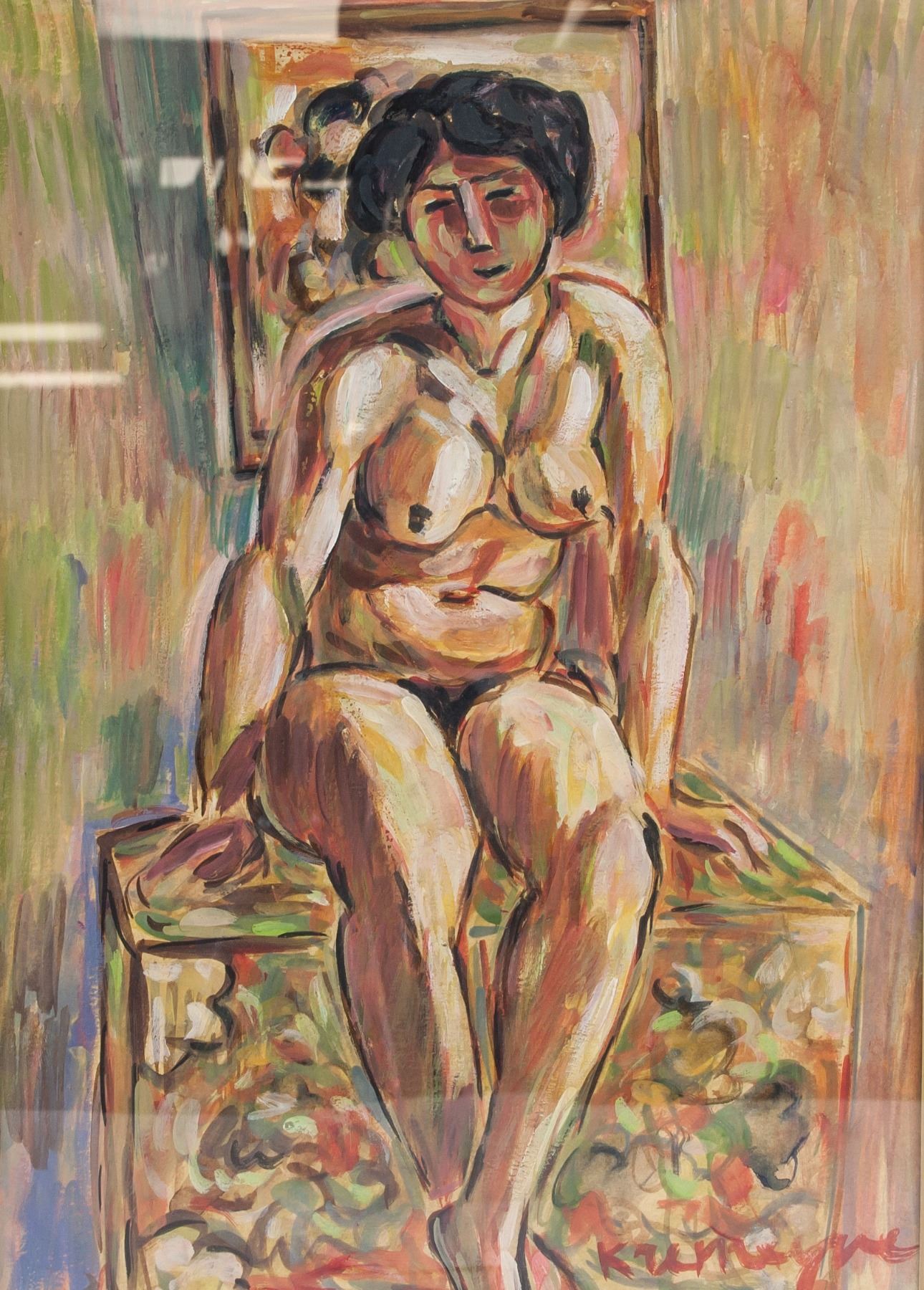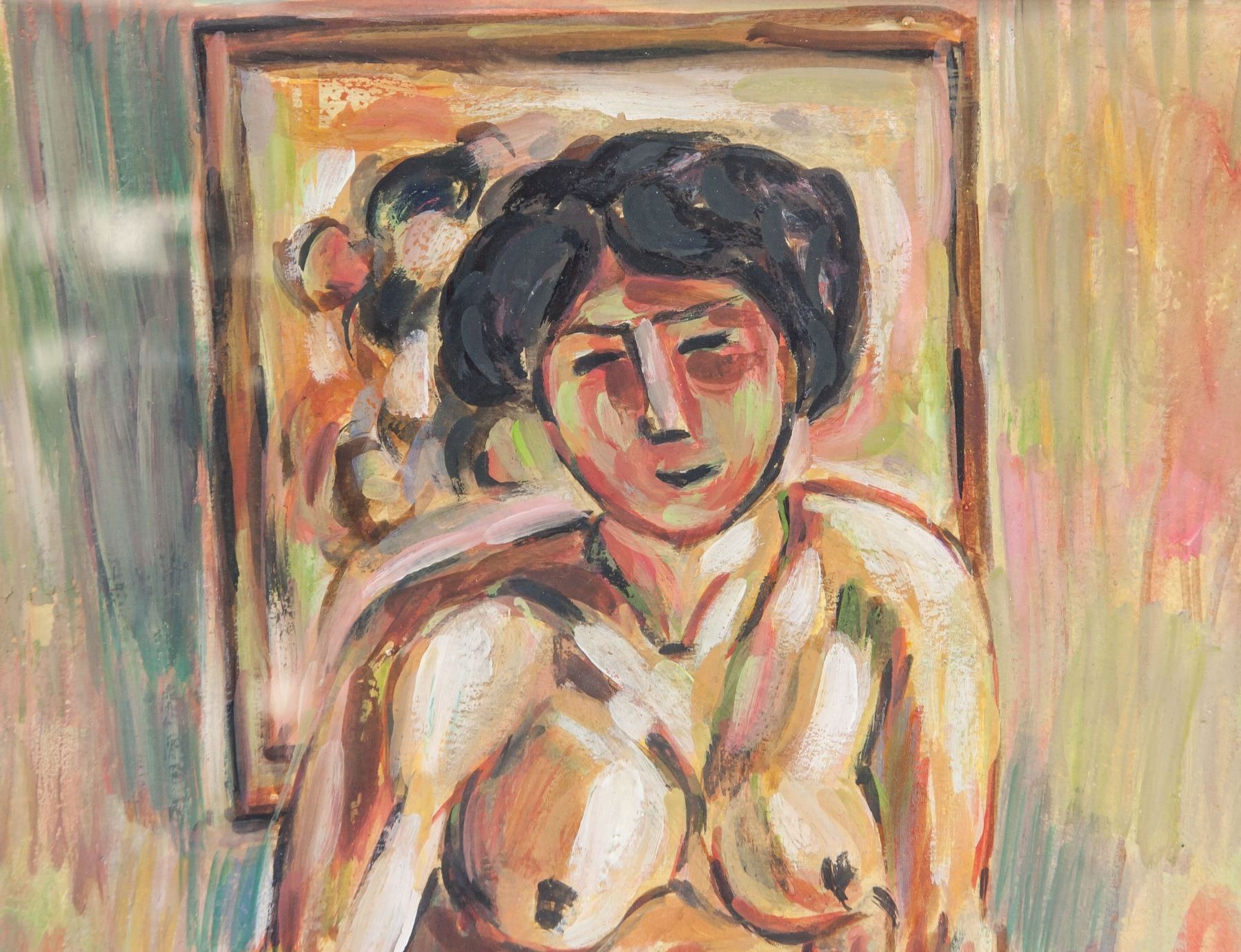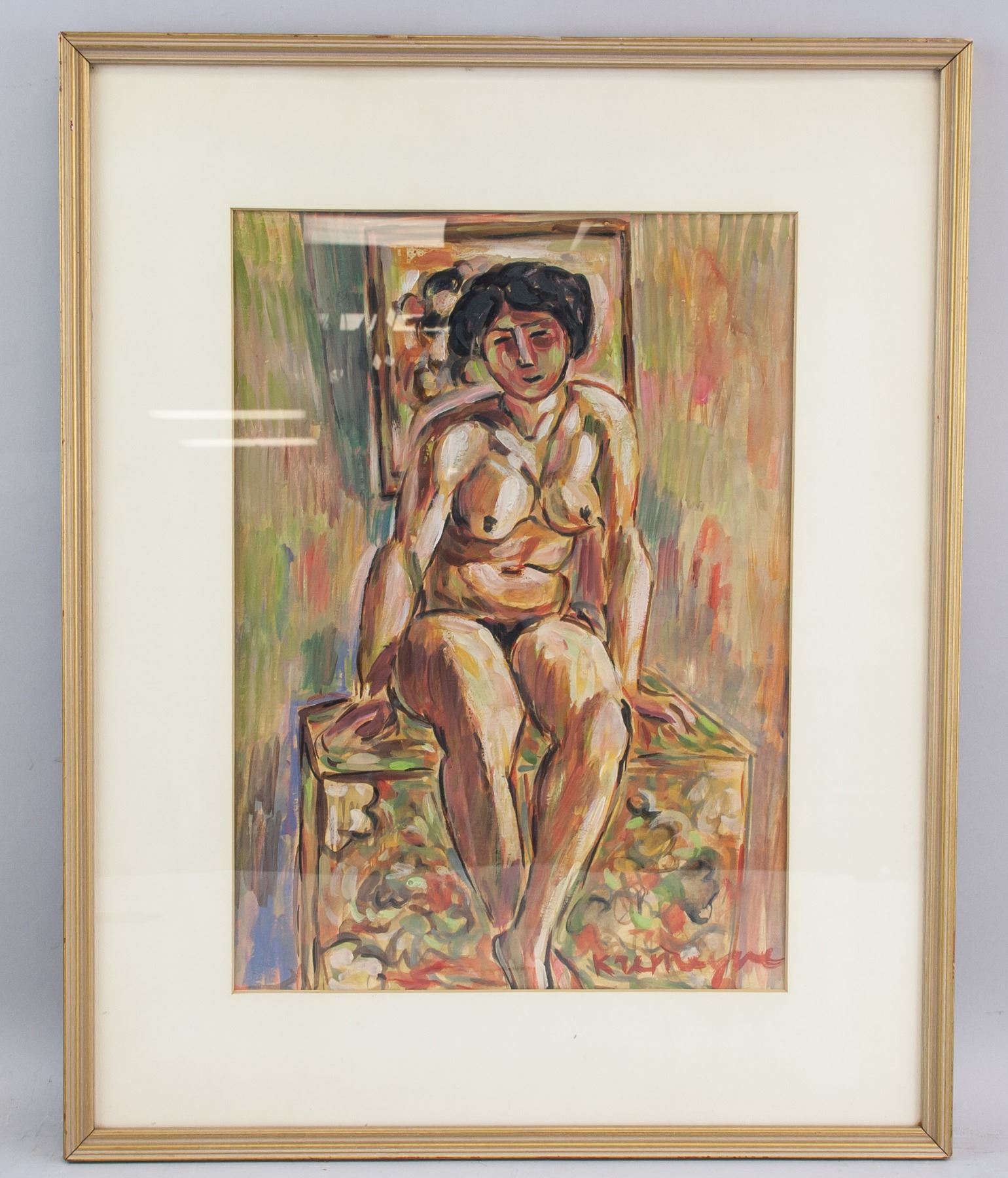 Nude gouache on paper. Signed and attr. Pinchus Kremegne (Russian, 1890-1981) on the lower right corner. 14 x 9.8 inch (35.5 x 25 cm). Kremegne was a Litvak-French artist, primarily known as a sculptor, painter and lithographer. He was a native of Zhaludak near Lida, and was a friend of both Chaim Soutine and Michel Kikoine. He studied sculpture at the Vilnius Academy of Art. He became a target of the pogroms because he was a Jew and fled to Paris in 1912. In Paris, Kremegne joined the group of painters of Montparnasse and soon became one of the respected residents of La Ruche. In 1915, he gave up sculpture in order to dedicate himself to painting. It was he who encouraged Soutine to come to Paris. He left Paris to live in a small town in the Pyrenees called Ceret. This village, which is a little inland from Collioure, attracted other painters such as Soutine. Although Soutine did not like the town very much, he completed many paintings there over a couple of years. He never settled but his compatriot Kremegne had a house built there around 1960. This small unassuming house, a reflection of the man himself, is nestled into the mountain and overlooks the village.