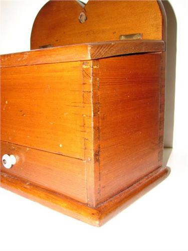 PINE HANGING WALL BOX. Dovetailed construction. Has lift-top with single drawer at bottom with porcelain knob. 10.25” H, 10.5” L, 6.25” D