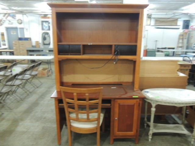 NICE COMPUTER DESK COMPLETE WITH MATCHING CHAIR AND HUTCH. 50" X 21" X78" OVERALL. LIGHT OVER WORK AREA. CORKBOARD AT THE BACK OF THE WORK AREA. DISC STORAGE AREA. SLIDE OUT KEYBOARD TRAY. TOWER STORAGE AREA WITH