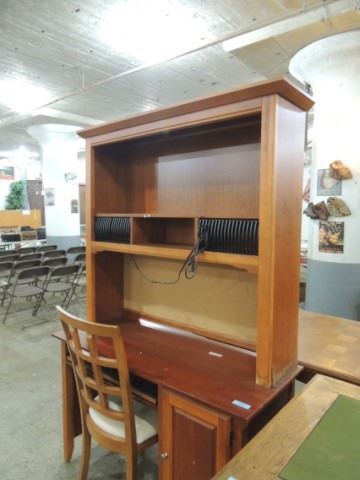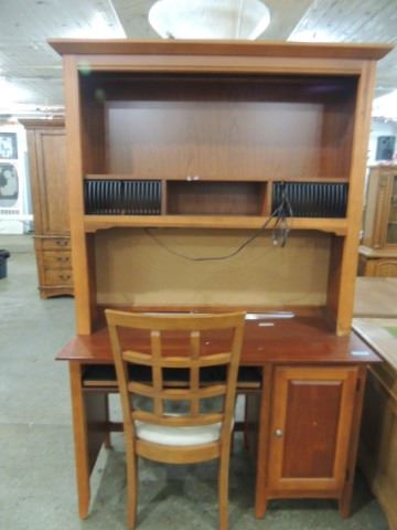 NICE COMPUTER DESK COMPLETE WITH MATCHING CHAIR AND HUTCH. 50" X 21" X78" OVERALL. LIGHT OVER WORK AREA. CORKBOARD AT THE BACK OF THE WORK AREA. DISC STORAGE AREA. SLIDE OUT KEYBOARD TRAY. TOWER STORAGE AREA WITH