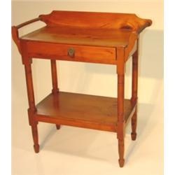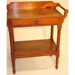 Pine single drawer washstand with spool turnings. Stretcher base. Good overall condition. 31.5" H, 27" W, 13.75" D