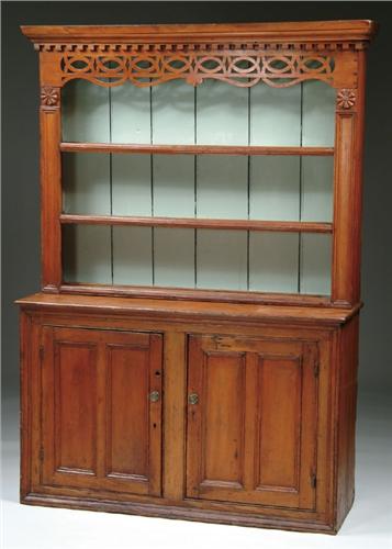 PINE STEPBACK CUPBOARD. 18th C, in two parts. Top part having cornice molding with dental feature below which is a frieze, pierce carved with intersecting semi-circles. Three shelves with plate rail and front molded board. The front sides having a thin molded panel topped by a carved rosette. The back beaded edge vertical panels have been painted a light green. The bottom section with two large doors, each having two molded edge panels fitted with later brass knobs. The whole base with molded frame. Mellow honey-brown natural finish. SIZE: 80in. h x 58-1/2in. at widest. Bottom is 18-3/4in. d, top is 11-1/2in. at deepest. CONDITION: 9-26018