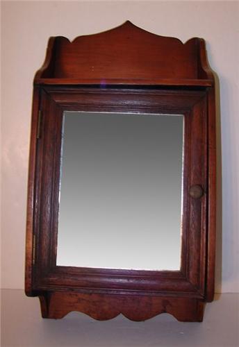 PINE WALL HANGING CABINET. Single door with beveled mirror and oak border. Has three shelves. 22” H, 11.5” W, 4.75” D