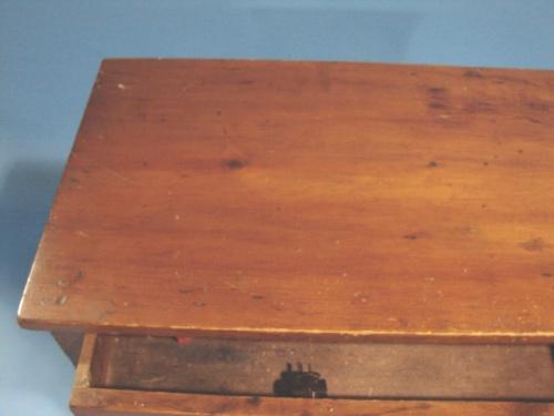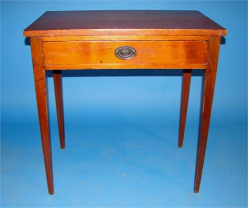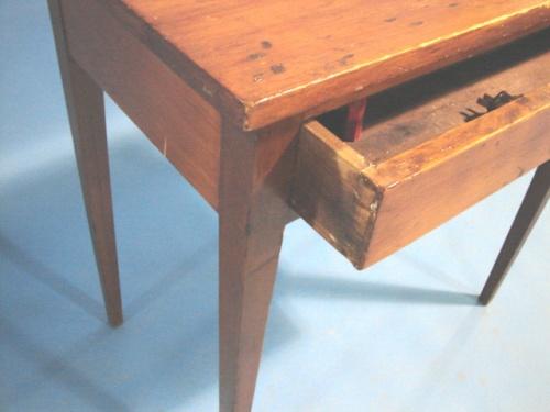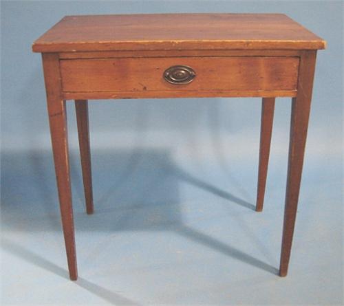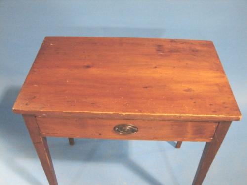 PINE WORK TABLE WITH SINGLE DRAWER. Tapered legs. Drawer is dovetailed. Pegged top. 29" H, 27.75" W, 16.75" D