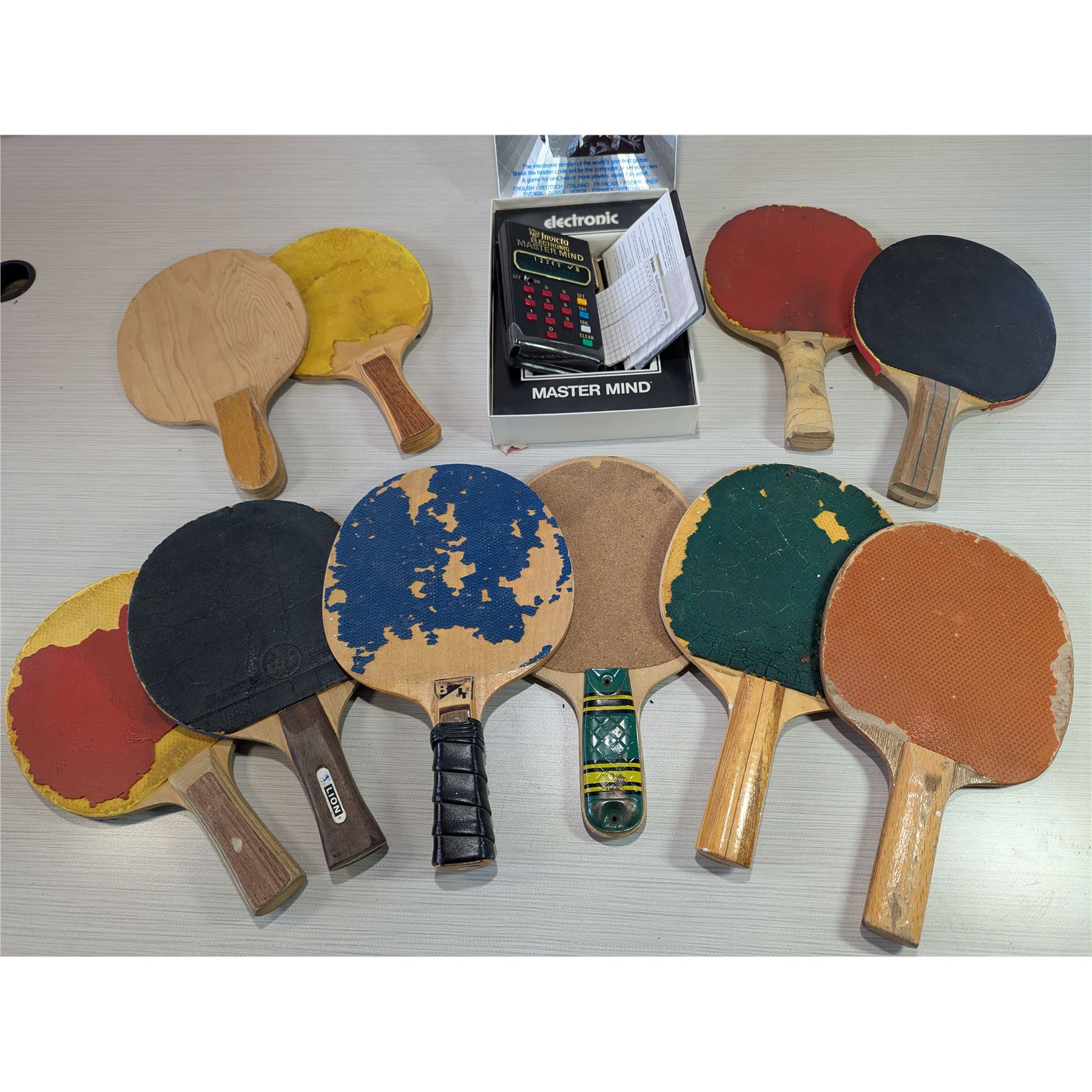 20 Vintage Ping Pong paddles ( in various degree of need for repair. Bonus one Electronic MASTERMIND game. Win at the table & in your mind:)