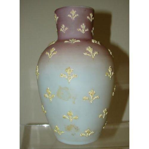 PINK AND WHITE CASED GLASS VASE. Ovoid form body with neck. Vase is decorated with beaded fleur-de-lis decorations throughout body. No mark. 6.75” H