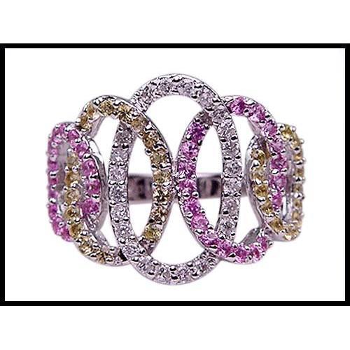 A wonderful ring of solid 18K white gold has been set with natural pink and yellow sapphires that have been cut like diamonds to exhitit high brilliance. 22 diamonds are superb color contrast. They offer a very pretty and subtle shift of colors. Great sparkle to piece. The ring is 23mm x 17mm, and weighs 5 grams. Size 7 is easy to change.