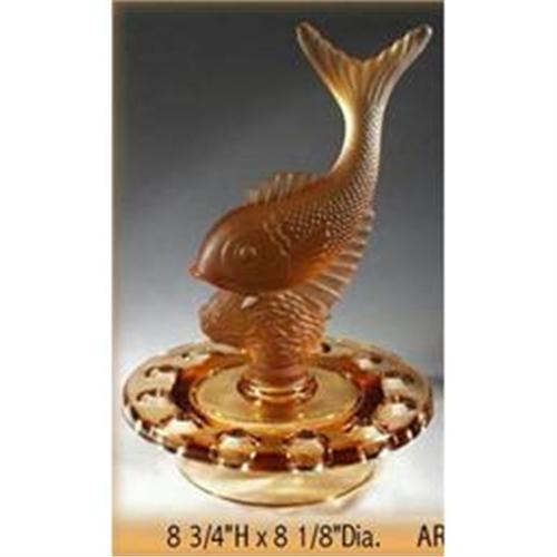 Absolutely gorgeous Art Deco Centerpiece!!! This 3 piece Art glass flower frog consists of a pink frosted finish glass fish, round pink glass centerpiece with 12 holes and black amethyst glass pedestal or bowl. Extremely well modeled fish with sharp detail has a hand cut "neck" which is fitted into the centerpiece. This stunning set survived its 70 years in excellent condition with no chips, cracks or repairs. Dimension : 8-3/4"H x 8 1/8" in diameter.