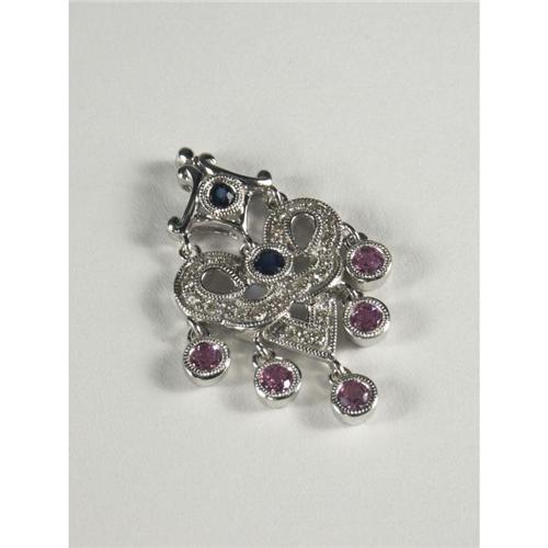 PENDANT: Graceful 14k white gold pendant set with pink and blue sapphires and accented with round cut diamonds. The sapphires measure approximately 0.50 ctw, and are transparent. The diamonds measure approximately 0.20 ctw, have VS2 to SI2 clarity and H color. Appraisal included.