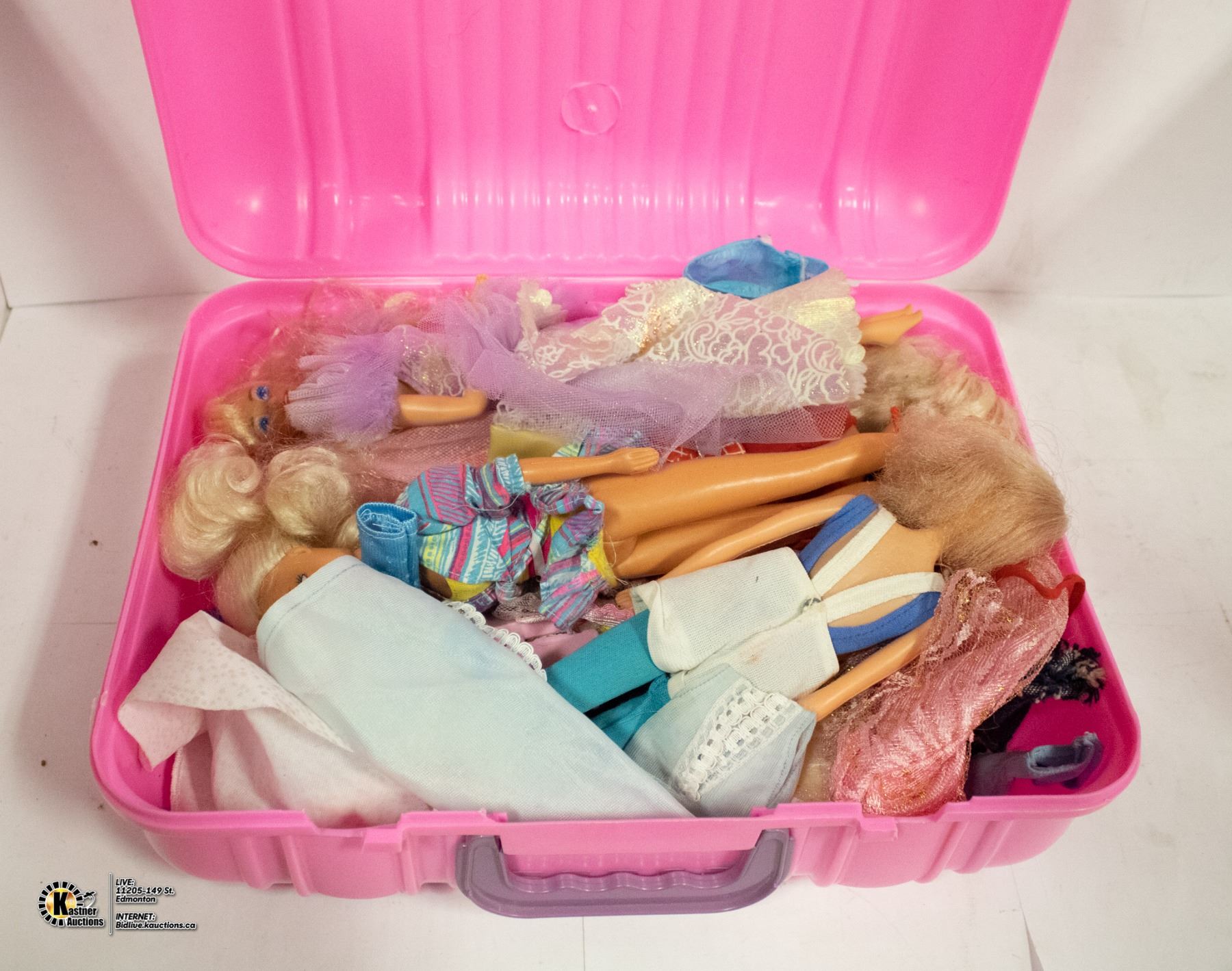 PINK BOX WITH ASSORTED VINTAGE BARBIES + MORE