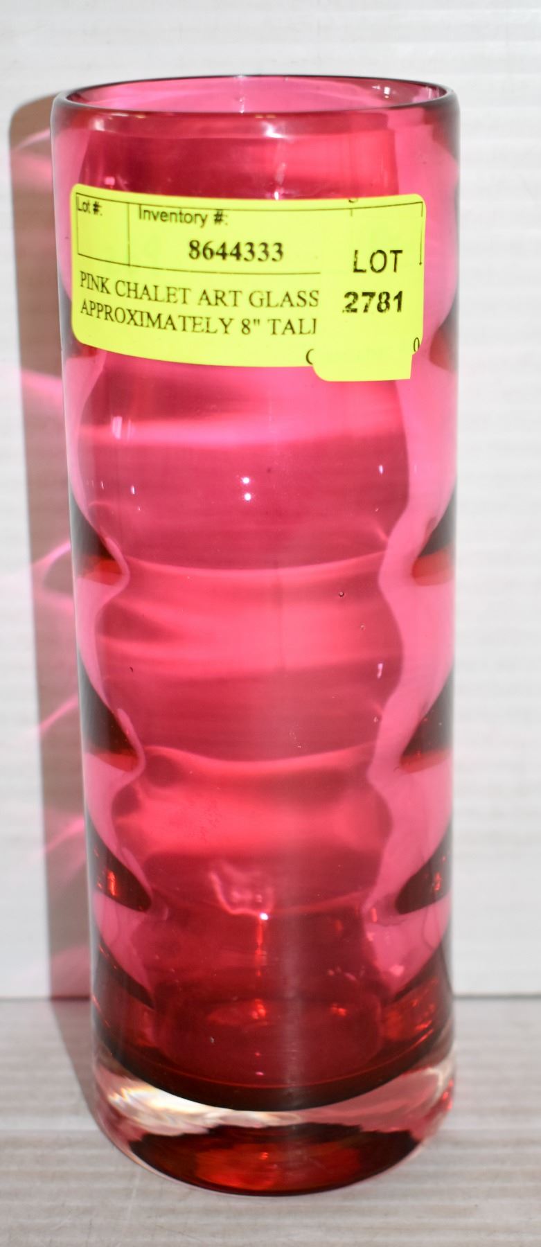 PINK CHALET ART GLASS APPROXIMATELY 8" TALL