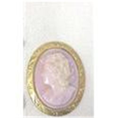 I BELIEVE THAT THIS FINE LADY IS PINK SLAG GLASS. SHE HAS BEAUTIFULLY DETAILED GRAPE LEAVES AND BUNCHES OF GRAPES IN HER HAIR TOGETHER WITH A BOW. HIGH RELIEF AND VERY WELL DONE. SHE MEASURES 1 1/2 BY 1 1/4 AND HAS THE OPEN C CLASP INDICATING AN EARLY 1900'S VARIETY.