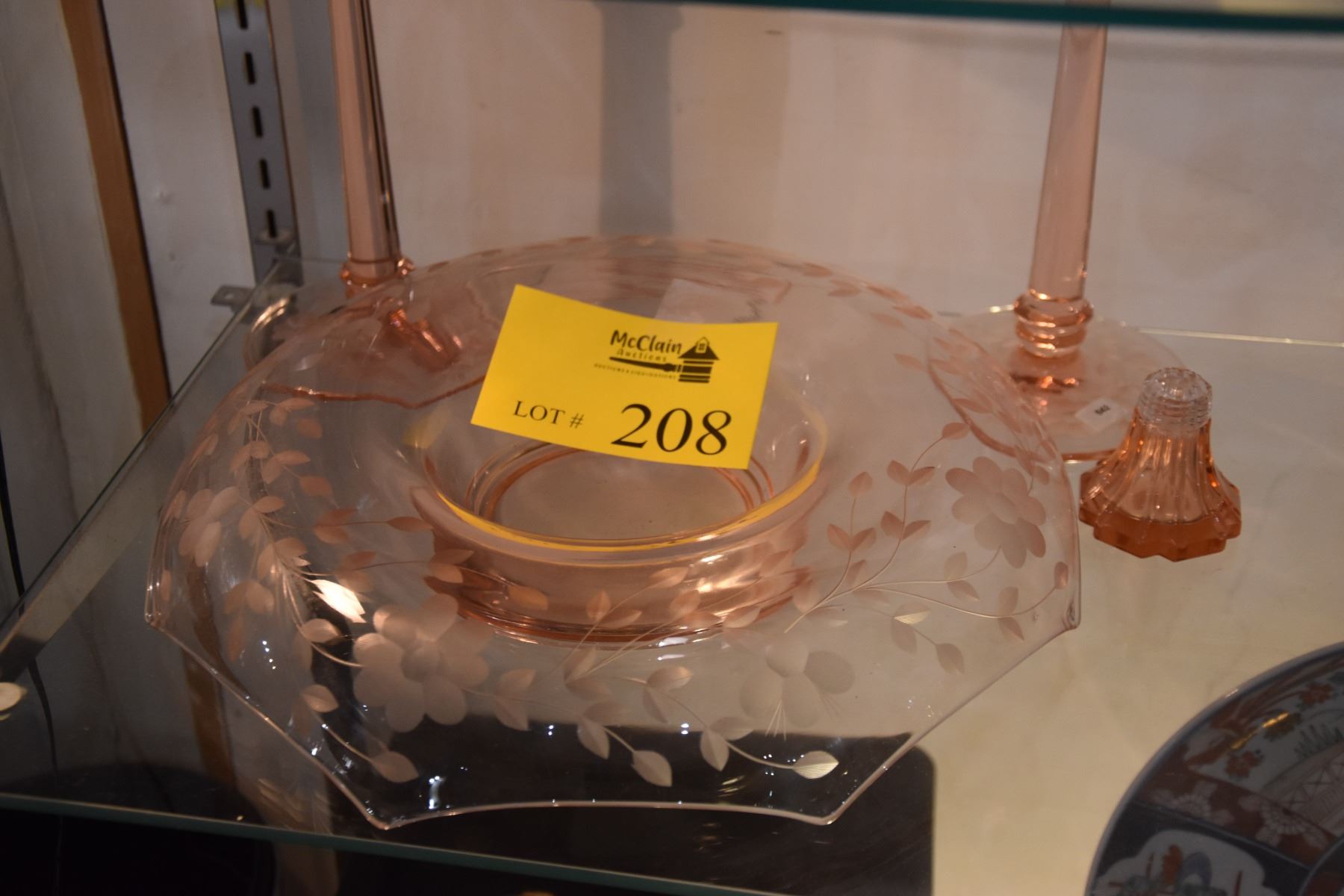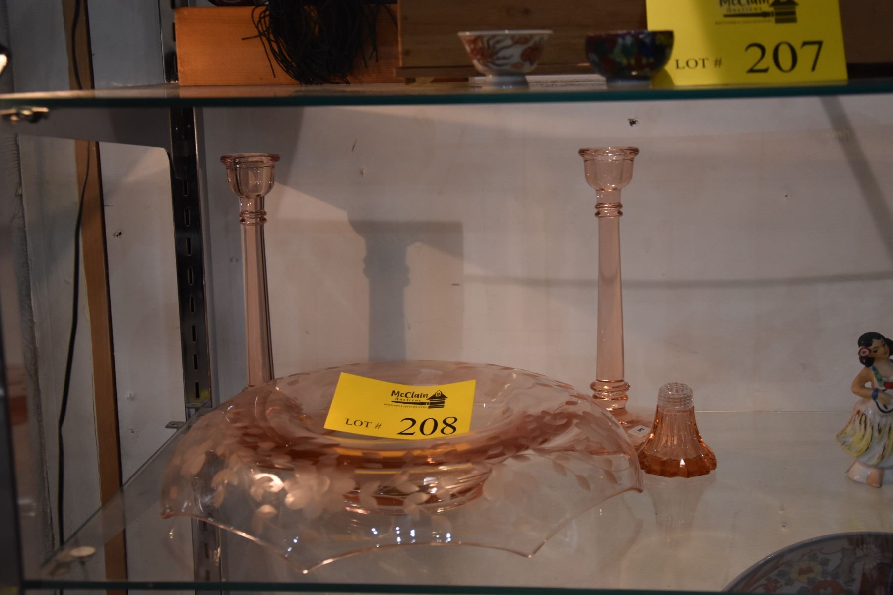 PINK DEPRESSION GLASS CANDLE HOLDERS, BOWL & SHAKER (4 PCS)