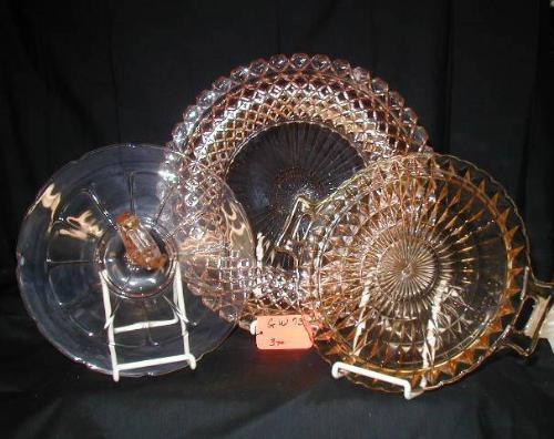 PINK DEPRESSION LOT INCLUDES, WATERFORD WAFFLE PLATE 13 3/4in PLATE, CAKE PLATE TAB HNDL. 11 1/2in, CTR. HNDL. COMPOTE, 3 PCS