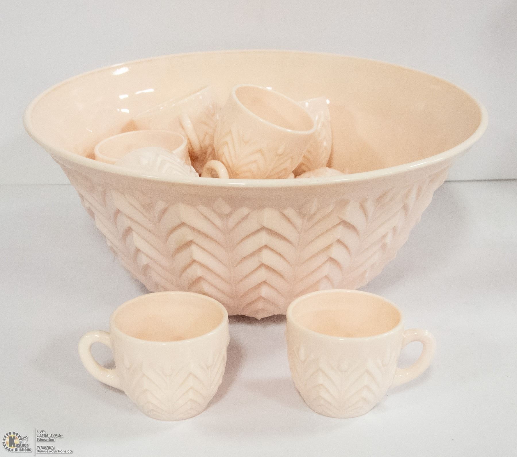 PINK GLASS PUNCH BOWL W/ 12 CUPS