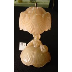 Pink glass dresser lamp. No cord. Base is girl in wide skirt with bonnet and bouquet. Shade is puffy shells with paneled dome. 9.25" tall and 5.5" wide at base. Condition: No chips, cracks or hairlines.