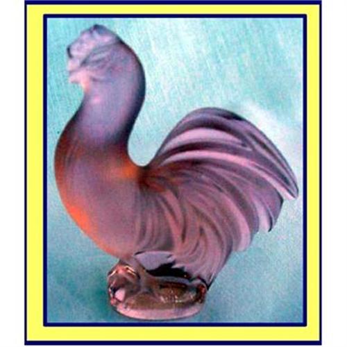 Pink Lalique glass figure of a rooster, the national emblem of France. These roosters were produced for less than 6 years and are retired.<BR>The rooster is 3inches high. He stands on an oval base. Very well done moulding from feet to comb, with fabulous tail and bright eyes.<BR>Signed Lalique France.<BR>Mint condition - absolutely no damage of any sort. Comes in original box.
