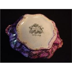 4 1/2" tall by 7 1/2" wide and 5" deep Pink lustre sugar bowl by Longton potters Everard, Glover & Colclough in their "Marble" pattern, no lid. Maker's mark "E.G. & C. No 12". Elegant footed piece has acorn handles and is lustre glazed over a black marbleized transfer; shape is molded with curved edges that give it a soft-edged appearance. Flake & chip inside rim and chip inside bowl.
