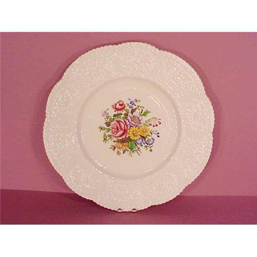 Absolutely Gorgeous Large Decorative Plate Wide Wide Lace Embossed Border Absolutely gorgeous LARGE English plate by the well loved maker Royal Cauldon. The pattern is COUNTRY BUNCH a glorious bouquet of colourful flowers; tat is surrounded by a very wide embossed LACE like border. This lace like embossed border is gorgeous! Flowers & Birds are repeated in the embossed pattern. This is one of the most beautiful plates we have seen in a while, the images just fall short of truly ?showing it off?, MUCH more beautiful in person! The condition is EXCELLENT no damage whatsoever, just perfect. It measures about 10 ½ inches, a spectacular decorative plate to enjoy displaying or using. Please be sure to view all images of this fine plate.If you enjoy collecting antique and vintage lace and linens, barkcloth, all things roses, Limoges & English china,Shabby Chic, Romantic Cottage and Paris Apartment décor , you may wish to bookmark us since we list often. Thanks and enjoy your day!