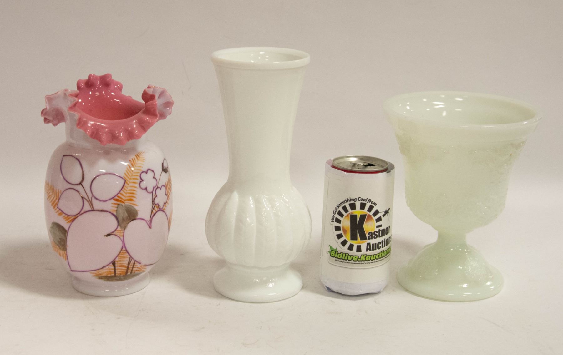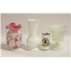 PINK RUFFLE VASE & 2 MILK GLASS VASES