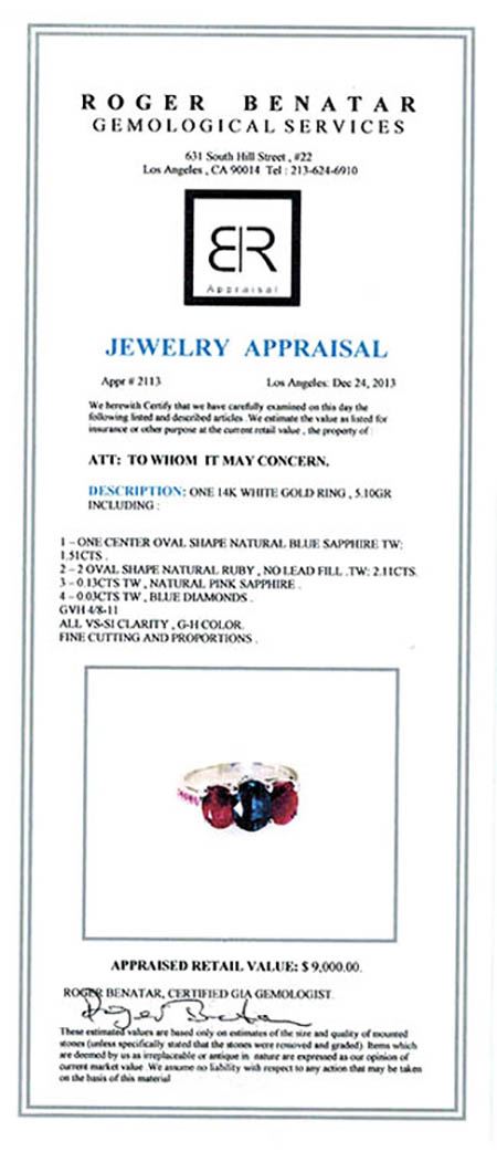 PINK SAPPHIRE 0.13CT / RUBY 2.11CT / BLUE SAPPHIRE 1.51CT, 14K W/G RING 5.10GRAM / DIAMOND RD 0.03CT