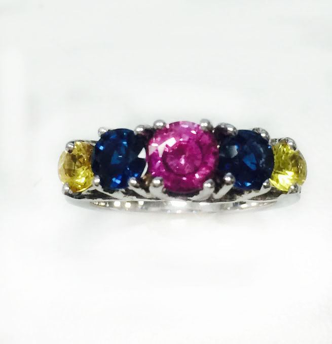 PINK SAPPHIRE 0.91CT, 14K W/G RING 5.59GRAM / DIAMOND 0.11CT / YELLOW ,BLUE SAPPHIRE 1.91CT