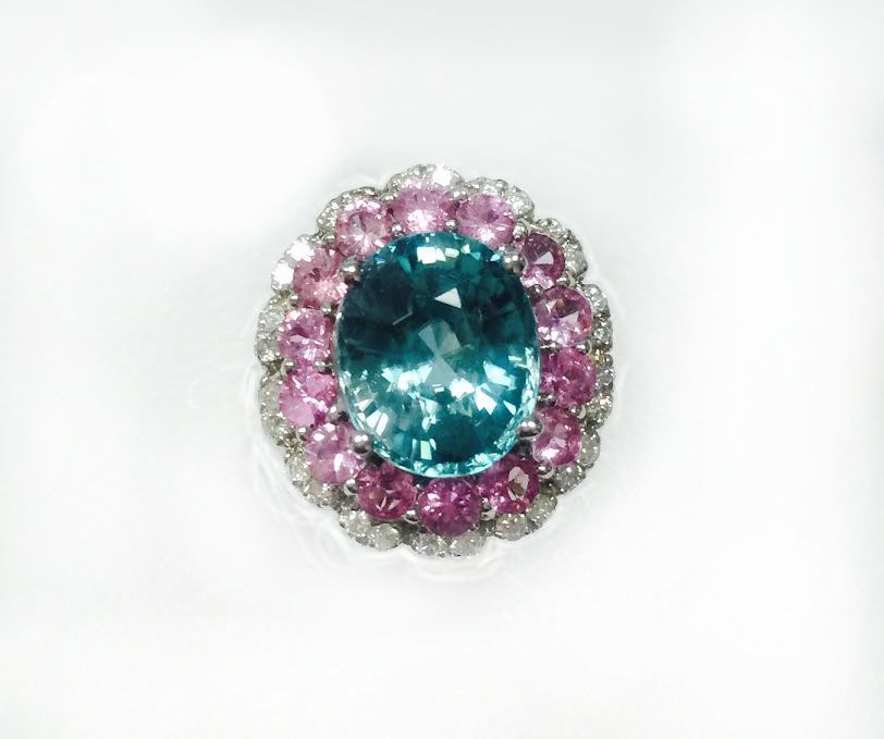 PINK SAPPHIRE 1.54CT / BLUE ZIRCON 8.90CT, 14K W/G RING 7.44GRAM / DIAMOND RD 0.36CT