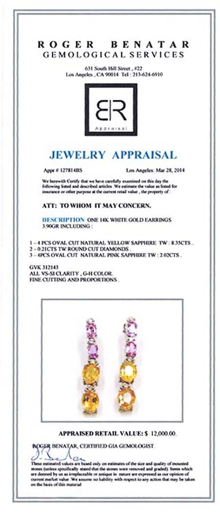 PINK SAPPHIRE 2.02CT / YELLOW SAPPHIRE 8.35CT, 14K W/G EARRING 3.90GRAM / DIAMOND 0.21CT