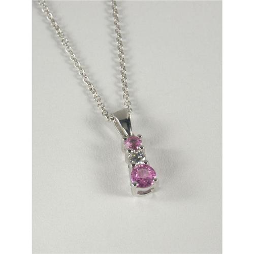 PENDANT WITH CHAIN: Dainty 14K white gold pendant set with two round cut pink sapphires and one round cut diamond. The sapphires measure approximately 0.25 ctw and are transparent to semi-transparent. The diamond measures approximately 0.04 cts, has SI2 clarity and I color. Appraisal included.