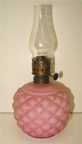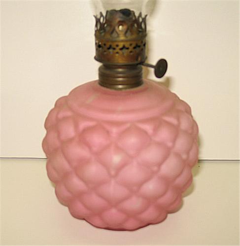 SMALL PINK SATIN GLASS LAMP. Puffy diamond quilted pattern. Burner knob is marked "E.M. and Co.". 8.5" H to top of chimney