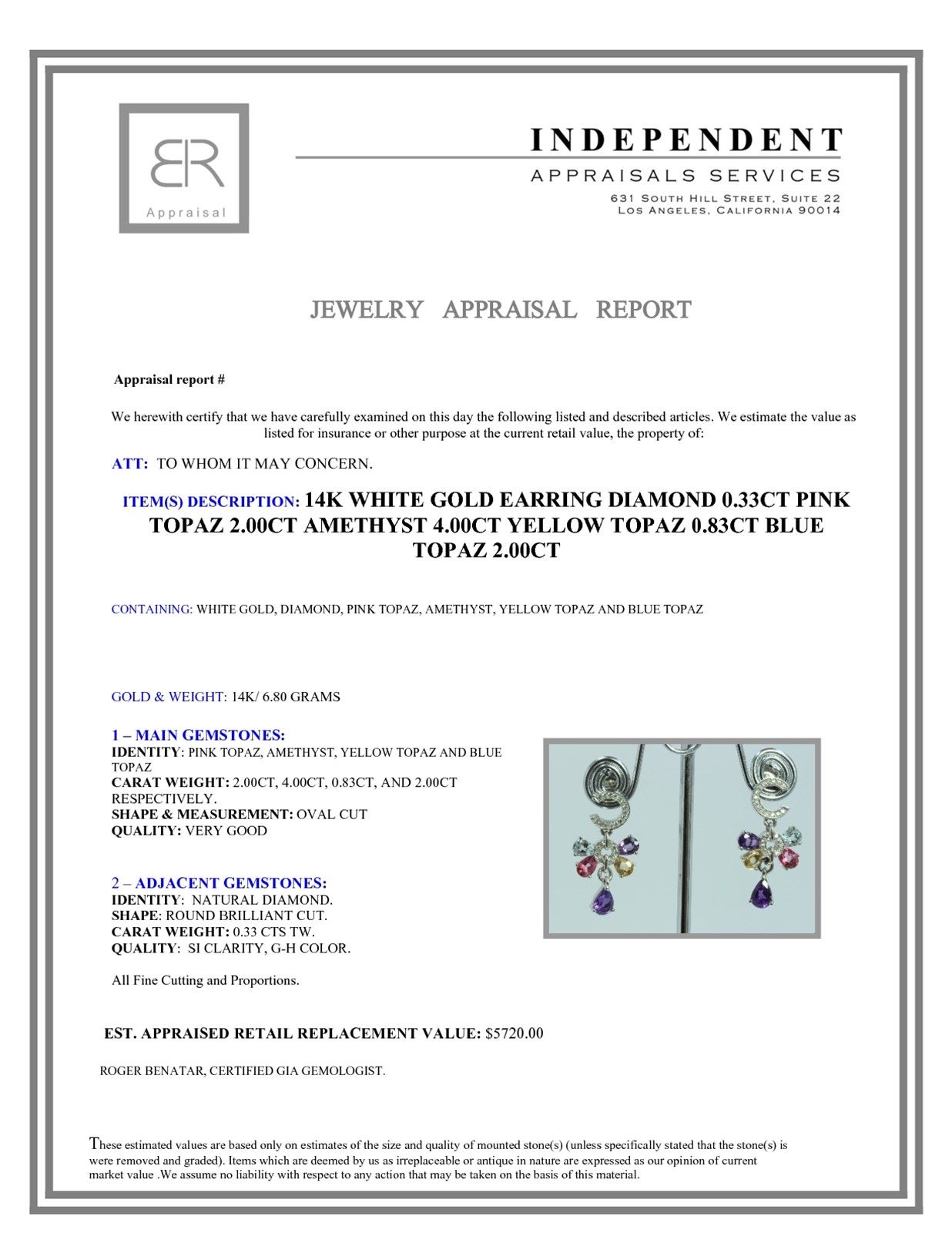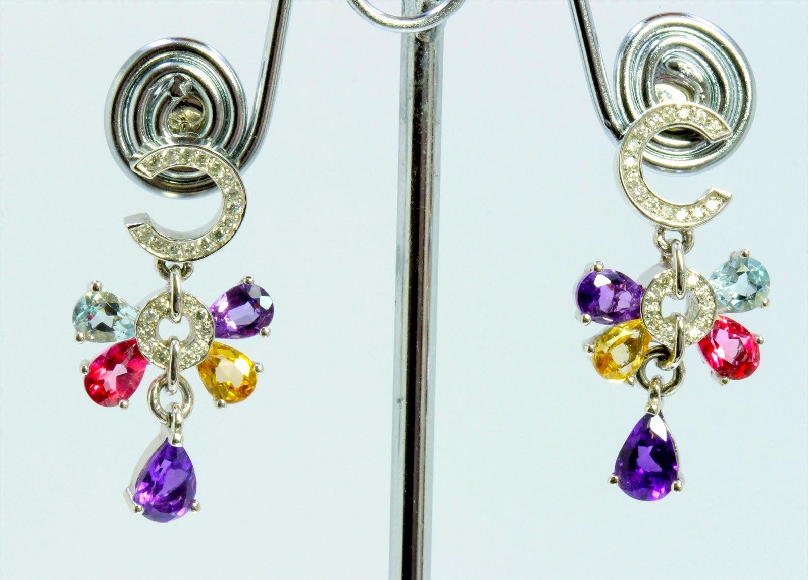 14K WHITE GOLD EARRING 6.80GRAM DIAMOND 0.33CT PINK TOPAZ 2.00CT AMETHYST 4.00CT YELLOW TOPAZ 0.83CT BLUE TOPAZ 2.00CT