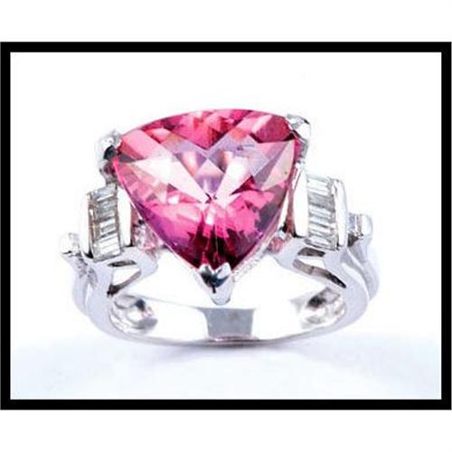 A NATURAL TOPAZ IS RICH PINK COLOR, AND EXHIBITS HIGH BRILLIANCE. IT WEIGHS 3 1/4 CARATS. 10 BAGUETTE DIAMONDS CREATE ELEGANCE. THEY TOTAL .30 CARATS. THE RING MEASURES 16MM X 12MM X 10MM (5/8" X 7/16" X 3/8"). A GREAT BUYER OPPORTUNITY!!