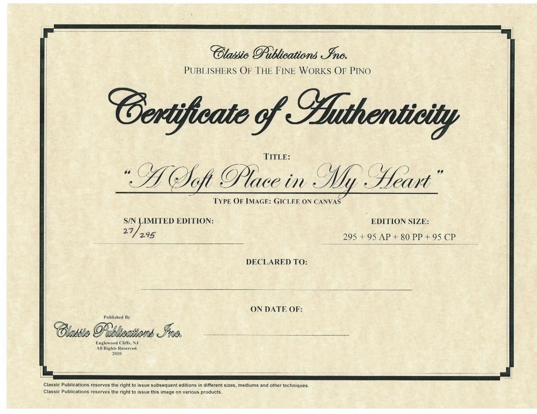 "A SOFT PLACE IN MY HEART" BY PINO - HAND SIGNED LIMITED EDITION GICLEE ON CANVAS - HAND SIGNED BY THE ARTIST - HAND EMBELLISHED - NUMBERED - COMES WITH PUBLISHER'S AUTHENTICATION - UNFRAMED SIZE 28" X 38"
