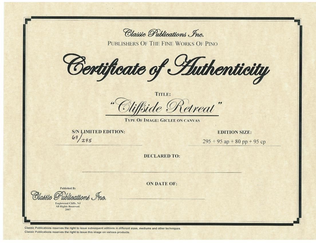 "CLIFFSIDE RETREAT" BY PINO - HAND SIGNED LIMITED EDITION GICLEE ON CANVAS - HAND SIGNED BY THE ARTIST - HAND EMBELLISHED - NUMBERED - COMES WITH PUBLISHER'S AUTHENTICATION - UNFRAMED SIZE 32" X 40"