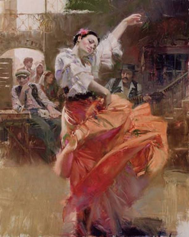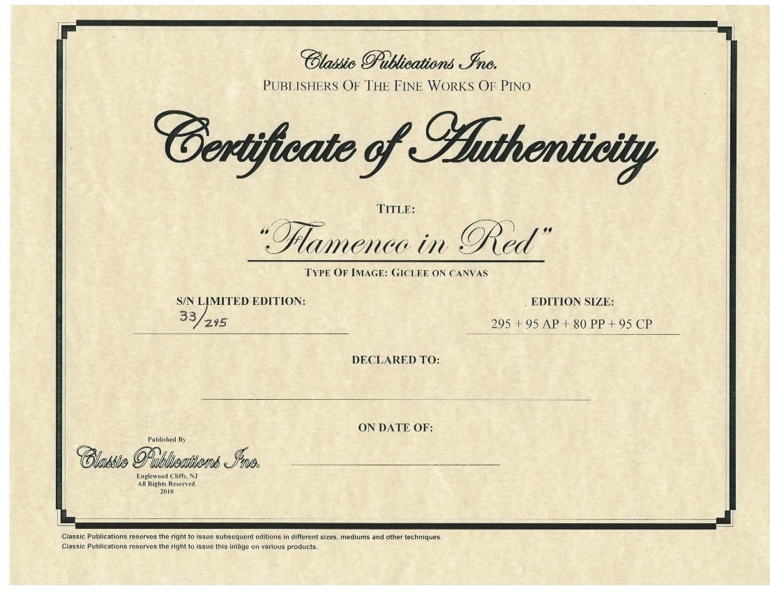 "FLAMENCO IN RED" BY PINO - HAND SIGNED LIMITED EDITION GICLEE ON CANVAS - HAND SIGNED BY THE ARTIST - HAND EMBELLISHED - NUMBERED - COMES WITH PUBLISHER'S AUTHENTICATION - UNFRAMED SIZE 46" X 36"