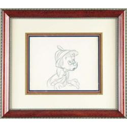 “PINOCCHIO” PRODUCTION DRAWING. An original production drawing by Milt Kahl for the 1940 Walt Disney production of “Pinocchio”. Appears to be unsigned, or may be matted out, but Certificate of Authenticity from American Royal Arts Corp. Westbury, N.Y. indicates it being drawn by Kahl. SIZE: Image size: 11 1/2”w. x 9” h. CONDITION: Near excellent; professionally framed. PF 1-3425 (3,500-5,500)