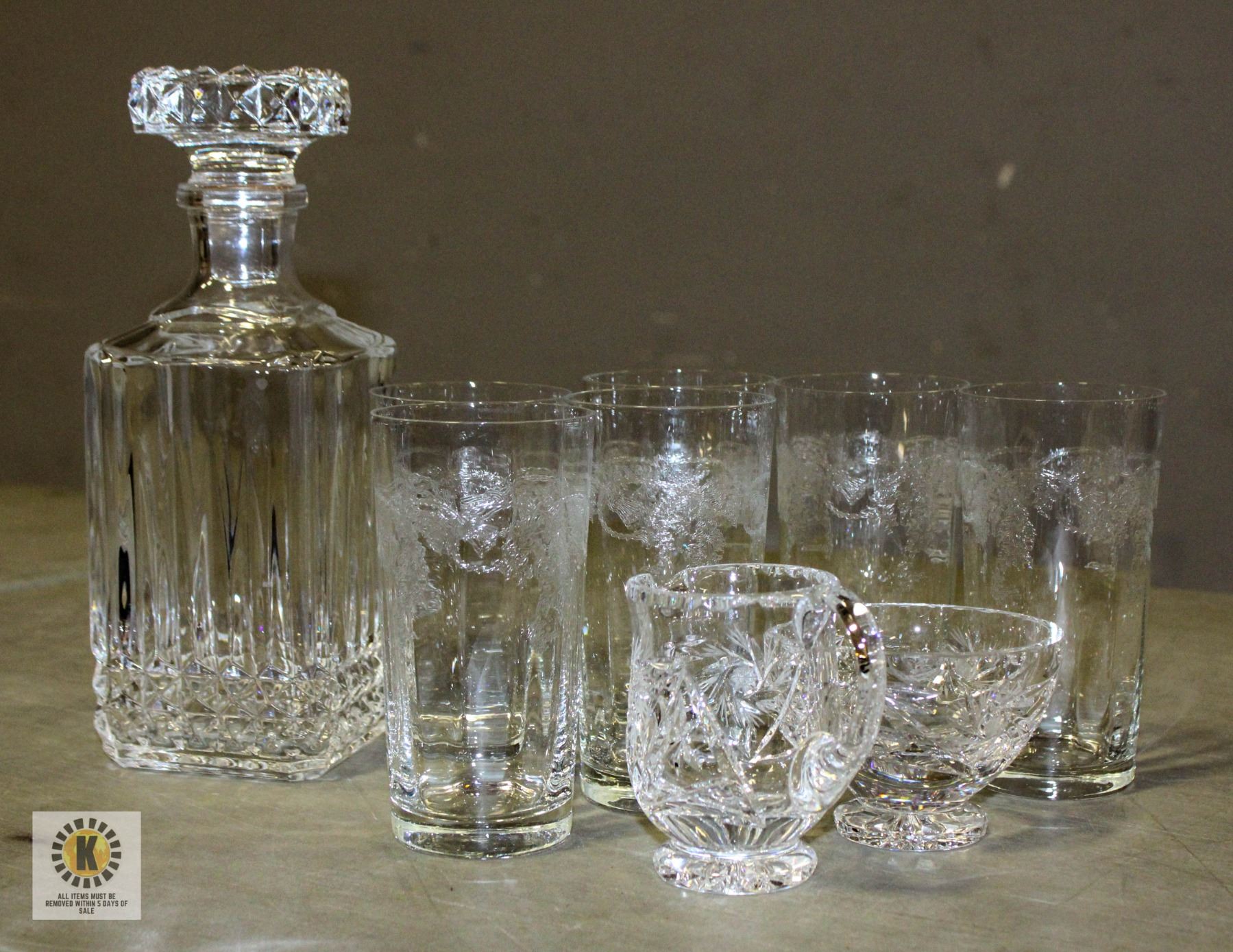 PINWHEEL CRYSTAL CREAM/SUGAR DISHES, DECANTER + 6