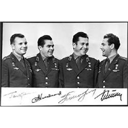 A superb signed Soviet space-related  photo, 6"" x 4"" b/w showing the first four Soviet cosmonauts in uniform from the waist, up in a candid, friendly group shot, signed in the white bottom margin by YURI GAGARIN, GHERMAN TITOV, ANDRIAN NIKOLAYEV and PAVEL POPOVICH. Gagarin's signature is just the slightest bit weak, else fine condition and a great item for display. 1701