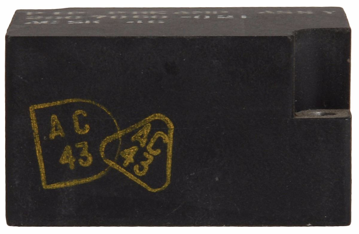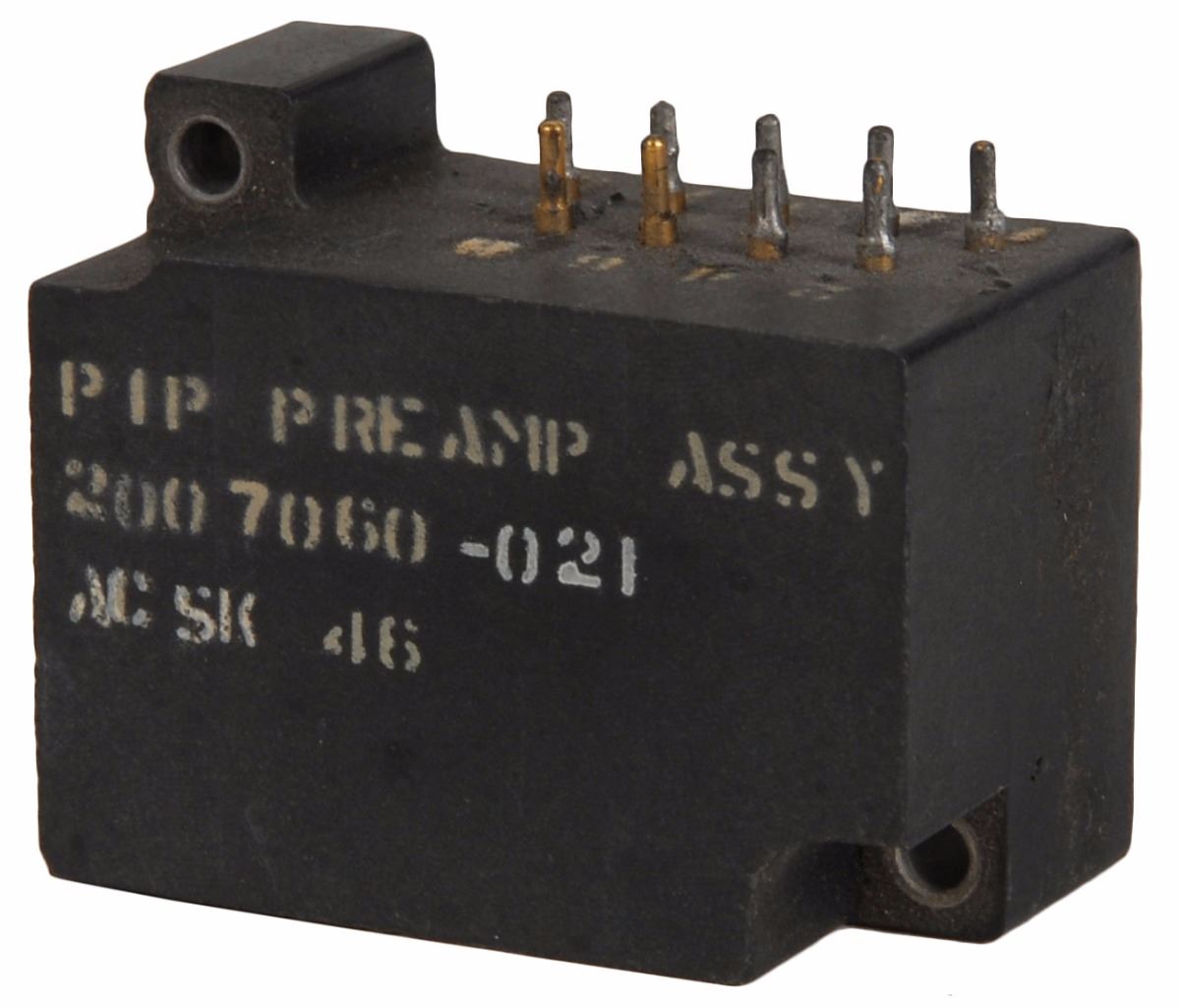 Small black electronic component with nine pins on one side, 1.5 x 1.25 x 1, stenciled with white text, “PIP Preamp Assy, 2004060-021, ACSK 46.” In fine condition.