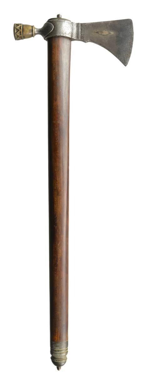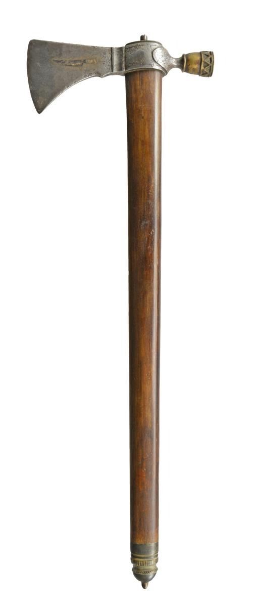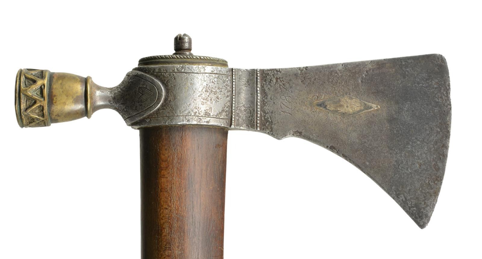 This inscribed forged tomahawk w/ brass bowl is pictured on page 129 Indian Tomahawks by Hartzler & Knowles. 8" x 3.25" head, 23" haft w/ pewter mouthpiece. One side of blade as inset engraved silver diamond below engraved “1787” opposite side has an inset knife engraved “L. Honour”. CONDITION: very good overall, haft is like new, iron has mottled gray patina w/ pitting. The vast majority of pipe tomahawks in the Hartzler book are original to the 18th & 19th century, several in our opinion including this one are contemporary & of 20th century manufacture. PROVENANCE: From the Collection of John "Tim" Breth Jr. (02-13821-1/JS). $800-1,200.